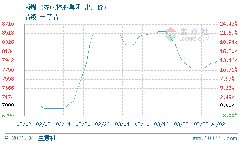 4月2日,齊成控股集團(tuán)丙烯最新報價上調(diào),漲50元/噸至7950元/噸。