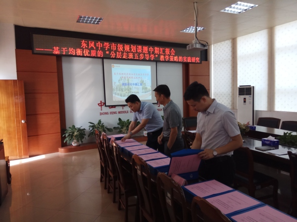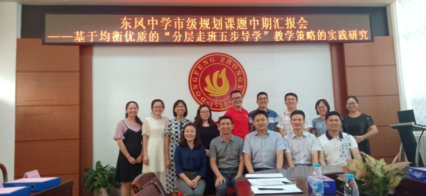10月10日下午,東鳳中學(xué)舉行市級(jí)規(guī)劃課題中期匯報(bào)會(huì),與會(huì)人員圍繞“基于均衡優(yōu)質(zhì)的分層走班五步導(dǎo)學(xué)教學(xué)策略的實(shí)踐研究”這一課題展開了熱烈的研討。出席此次會(huì)議的有市教研室張?zhí)﹦偫蠋?、辛鍵老師,東鳳鎮(zhèn)教育事務(wù)指導(dǎo)中心陳林方老師,課題主持人東鳳中學(xué)劉喜全校長(zhǎng)以及課題組全體成員。蔣燕梅副校長(zhǎng)主持此次匯報(bào)會(huì)。匯報(bào)會(huì)分為專家組查閱資料、主持人作課題中期匯報(bào)、專家組點(diǎn)評(píng)指導(dǎo)三部分。