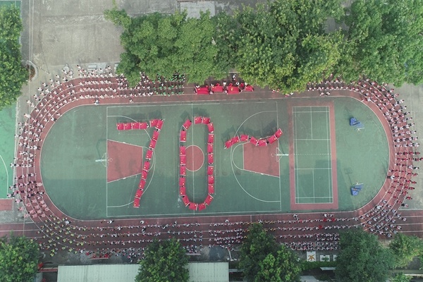精彩的快閃活動達到了高潮,國旗方隊迅速變換隊形,隊員們雙手托著鮮艷的國旗,在操場中央變換出大大的“70”字樣,來慶祝新中國成立70周年,旗面飄動,鮮艷的“70”字樣在藍天白云、綠蔭的映襯下是那么耀眼。同時呂曉寧老師吹起了竹笛,張嘉怡老師彈奏起古箏,與民樂團學生一起合奏《今天是你的生日》,各班師生一起高唱“……我們祝福你的生日我的中國,愿你逆風起飛雨中獲得收獲,我們祝福你的生日我的中國,這是兒女們心中希望的歌,這是兒女們心中希望的歌……”這祝福的歌聲縈繞在學校的每個角落,感動著全校師生。