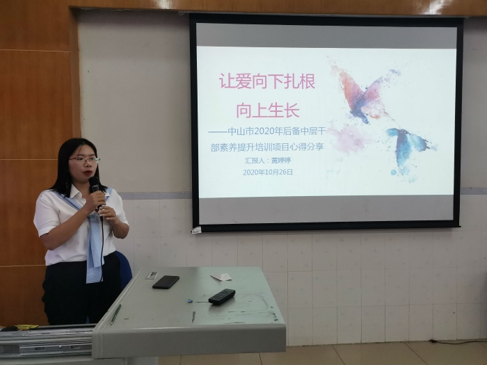為夯實中山市中小幼學校后備中層干部人才,提高干部隊伍整體素質,來自中山市各中小幼學校的30位教師前往華南師范大學參加為期6天的中山市2020年后備中層干部素養(yǎng)提升培訓項目。10月26日下午,中山市阜沙鎮(zhèn)豐聯(lián)小學黃婷婷主任與全體教師分享了在中山市2020年后備中層干部素養(yǎng)提升培訓項目中的心得體會,共同交流討論教育工作者應如何實現(xiàn)職業(yè)理想與幸福。
