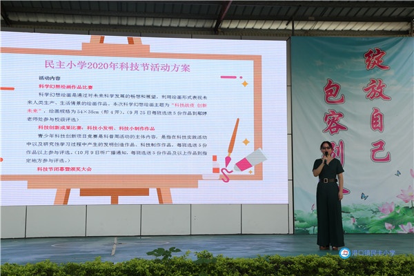 濃情九月,碩果飄香。為全面貫徹落實(shí)《全民科學(xué)素質(zhì)行動(dòng)計(jì)劃綱要》精神,在全校大力普及科學(xué)知識(shí),弘揚(yáng)科學(xué)精神,形成學(xué)科學(xué)、愛科學(xué)、用科學(xué)的良好氛圍,2020年9月21日上午,民主小學(xué)全體師生齊聚學(xué)校操場,舉行“科技 創(chuàng)新 體驗(yàn) 成長”為主題的2020學(xué)年科技節(jié)啟動(dòng)儀式?;顒?dòng)由余麗苑老師主持。
