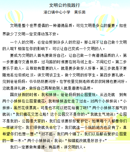高年級的學生們根據自己對文明公約的理解,圍繞文明公約展開思考,有的學生告訴了同學們?yōu)槭裁匆獙W習文明公約;有的學生從怎么做一個文明的人出發(fā);有的學生闡述了文明公約的具體內容。學生們都寫到自己或自己身邊關于文明的小事,或做得文明,或需要改進。學生們的作文盡情書寫了自己對于文明的所感、所想、所悟,同時也在寫作中領悟到今后要用自己的行動帶動和感染周圍同學,從自我做起,從現在做起,努力爭做一個講文明,懂禮儀的好學生。