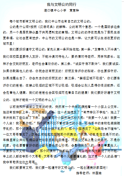 此次活動的開展,增強了學生的文明意識,學生們更加理解了文明公約的內容,懂得了文明之行,從我做起,從小事做起的道理。