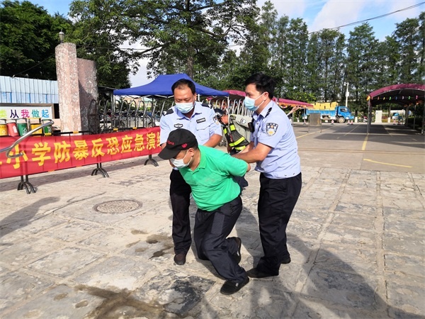 早上7:50,防暴反恐應(yīng)急演練正式開(kāi)始。演練以模擬保安人員報(bào)告有“歹徒”闖入校園這一情景展開(kāi),校長(zhǎng)蘇少麗接到報(bào)告后立即指示保安利用一鍵報(bào)警進(jìn)行報(bào)警,同時(shí)發(fā)出警報(bào),要求學(xué)生們保持鎮(zhèn)靜,安全躲避,組織教師有序、快速地引導(dǎo)學(xué)生到教室進(jìn)行躲避。學(xué)校安全組成員聽(tīng)到警報(bào)馬上趕到現(xiàn)場(chǎng),與保安人員手持警棍、防衛(wèi)器械等與“歹徒”搏斗,最終將“歹徒”按倒在地,將其制服。本次演練順利完成,達(dá)到了預(yù)期目的。演練結(jié)束后,蘇校長(zhǎng)肯定了全體師生在演練過(guò)程中的果敢表現(xiàn),并對(duì)本次演練活動(dòng)進(jìn)行了總結(jié)。