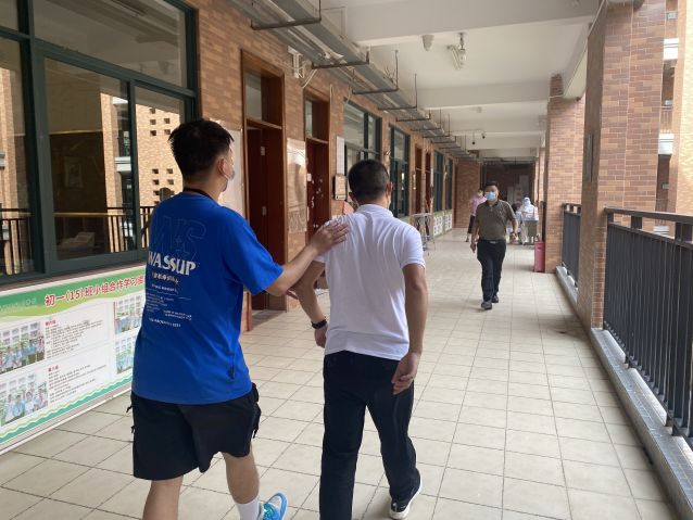 上課時(shí),師生全程佩戴口罩。有學(xué)生身體不適,經(jīng)確認(rèn)該生返校前有與密接者接觸史,任課教師立即停止講課,向年級(jí)行政報(bào)告,年級(jí)行政安排相關(guān)醫(yī)務(wù)人員帶領(lǐng)不適學(xué)生走出教室,到醫(yī)務(wù)室測(cè)量體溫后,送往隔離室。