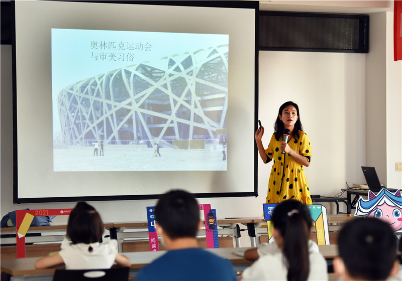 阮波從近期東京奧運(yùn)會(huì)講起,從“奧林匹克運(yùn)動(dòng)會(huì)與審美習(xí)俗”,到東西方神話人物在衣服穿搭、妝容、人物性格塑造的異同及戲劇人物的審美比較,論證“真”“善”“美”的辯證聯(lián)系。過程中阮波不時(shí)提問,邀請(qǐng)親子家庭互動(dòng)作答,引導(dǎo)家長從小注重對(duì)孩子審美能力的培養(yǎng),并推薦相關(guān)閱讀書目。