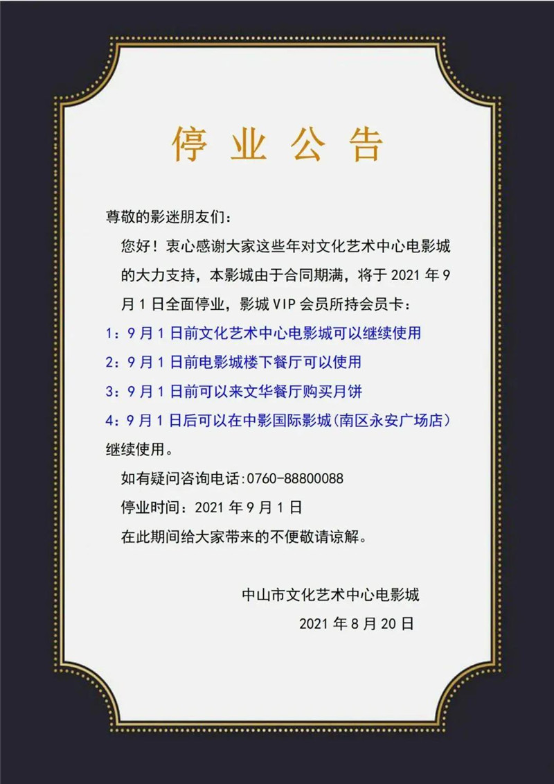 8月21日,不少市民向中山日?qǐng)?bào)報(bào)料稱,中山市文化藝術(shù)中心電影城近日發(fā)布了停業(yè)公告,稱影城由于合同期滿,將于2021年9月1日全面停業(yè)。