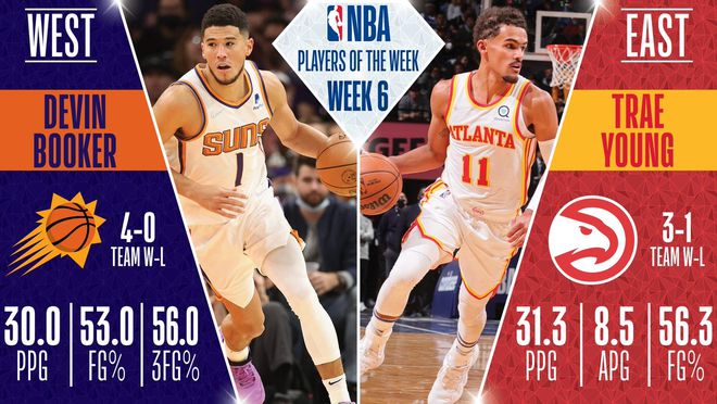 NBA官方宣布,憑借過(guò)去一周的出色表現(xiàn),亞特蘭大老鷹隊(duì)的楊和菲尼克斯太陽(yáng)隊(duì)的布克被評(píng)為東西部第6周的周最佳球員(當(dāng)?shù)貢r(shí)間11月22日~28日)。