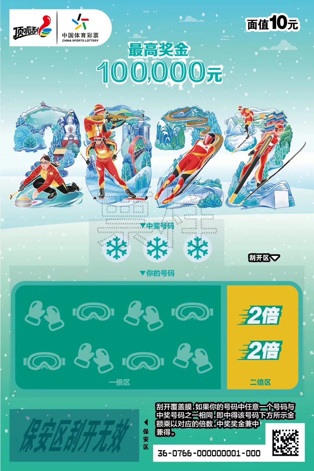 此前我們已經(jīng)介紹過體彩虎年生肖票了,而2022北京冬奧會是中國體育的第一盛宴,“2022”主題票面通過數(shù)字2022展現(xiàn)出中國體育健兒在冰雪運動中英姿颯爽,也號召大家喜迎北京冬奧、為中國體育加油?!?022”面值10元,游戲玩法為數(shù)字匹配,共有10次中獎機會,最高獎金10萬元。