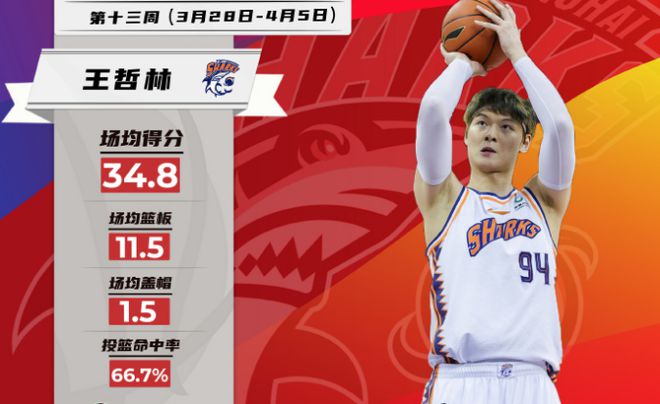 上海內(nèi)線核心王哲林在第13周出戰(zhàn)4場(chǎng),率隊(duì)取得3勝1負(fù)的戰(zhàn)績(jī),他場(chǎng)均出場(chǎng)36分鐘,貢獻(xiàn)出34.8分、11.5籃板、1.5蓋帽的優(yōu)質(zhì)數(shù)據(jù),投籃命中率高達(dá)66.7%,并且在常規(guī)賽收官戰(zhàn)面對(duì)北控,拿下創(chuàng)CBA本土球員歷史第二高紀(jì)錄的61分。