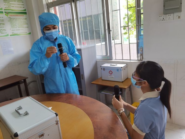 上午9:30,演練正式開始。其中著重演練課中突發(fā)事件的情景令人印象深刻,各位老師都投入到安排好的角色中。上課期間,一名學生報告老師不舒服,有咳嗽和嘔吐癥狀。上課老師隨即指揮班干部轉移其他學生,通知醫(yī)學觀察老師處理。該生來到留觀室醫(yī)學觀察老師初步了解生病學生的情況,了解其近14天內流行病學史。