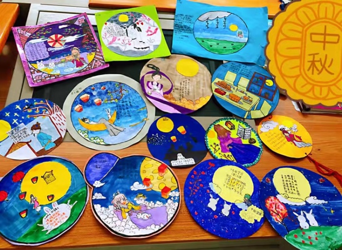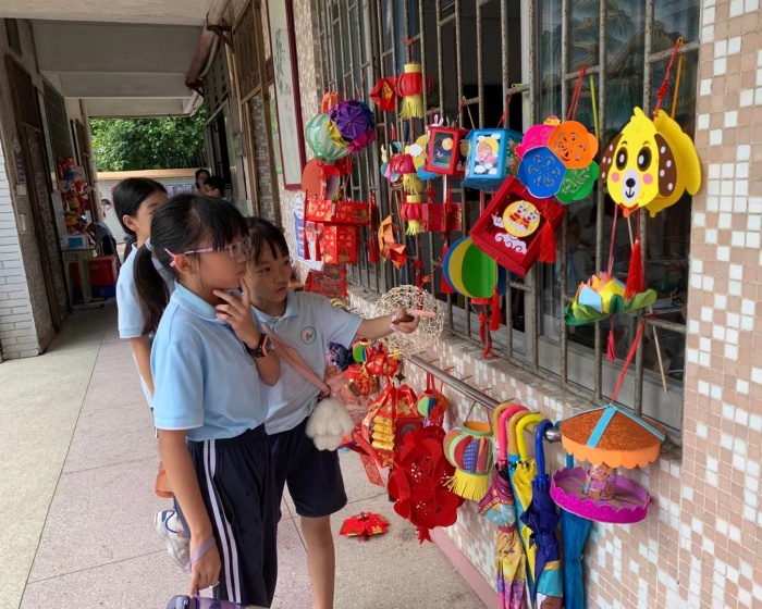 看,校園里張燈結(jié)彩,各式各樣的燈籠精彩紛呈,一片喜氣洋洋。有惟妙惟肖的動(dòng)物燈、紅紅火火的花燈,古色古香的水墨畫燈、色彩繽紛的繡球燈,甚至還有新年紅包做成的紅包等。除了制作燈籠,大涌南文小學(xué)的學(xué)生們還繪制了一大批色彩明艷、趣味十足的詩(shī)配畫作品。繪畫過程中,同學(xué)們暢談?dòng)嘘P(guān)中秋的習(xí)俗,把與中秋節(jié)相關(guān)的古詩(shī)結(jié)合著繪畫融入到一張張生動(dòng)的“詩(shī)配畫”中,讓大家一起了解嫦娥奔月,吳剛伐桂,玉兔搗藥等傳統(tǒng)佳話。同學(xué)們一起觀賞著眾人的佳作,時(shí)而雀躍,時(shí)而輕嘆,不時(shí)傳出陣陣歡呼和掌聲。
