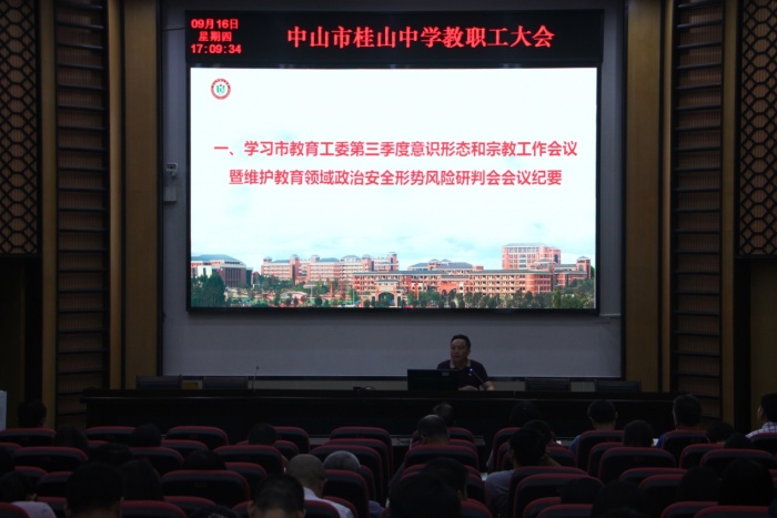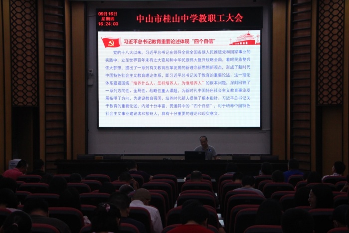 為持續(xù)深入學(xué)習(xí)領(lǐng)會(huì)習(xí)近平總書記“七一”重要講話精神,9月16日下午,桂山中學(xué)在德馨樓一樓報(bào)告廳開展主題黨課學(xué)習(xí)。主題黨課的主要學(xué)習(xí)內(nèi)容是習(xí)近平總書記“四個(gè)自信”和“七一”重要講話精神中蘊(yùn)含的“中國(guó)之治”與“中國(guó)之智”。主題黨課由學(xué)校黨委委員劉云平同志主持。