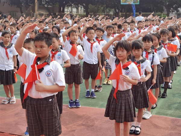 最后,全體少先隊(duì)員向國(guó)旗敬禮,表達(dá)對(duì)祖國(guó)的支持和尊重,左手國(guó)旗,右手敬禮,少先隊(duì)員們站得挺拔筆直。雖然天氣炎熱,后背早已濕透,可是大家對(duì)于祖國(guó)母親的熱愛(ài),已然沖破了一切困難,這一刻,他們都為自己生在華夏而自豪!