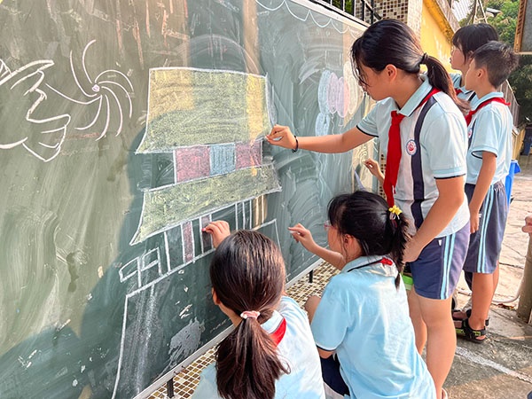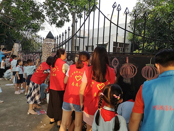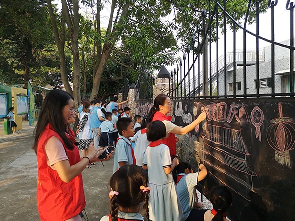 為使學(xué)生了解新中國(guó)建立的艱辛歷程和祖國(guó)建設(shè)取得的偉大成就,理解中國(guó)共產(chǎn)黨領(lǐng)導(dǎo)中國(guó)人民走社會(huì)主義道路是歷史的必然選擇,增強(qiáng)對(duì)偉大祖國(guó)、黨和人民的熱愛(ài),進(jìn)一步把愛(ài)國(guó)情感化為具體行動(dòng),立志為實(shí)現(xiàn)中華民族偉大復(fù)興作出貢獻(xiàn),在祖國(guó)母親生日到來(lái)之際,濠涌小學(xué)的黨員教師帶領(lǐng)家長(zhǎng)義工和學(xué)生一起布置起班級(jí)的涂鴉墻。小小巧手贊祖國(guó),大大畫(huà)筆繪山河,涂鴉墻在大家的共同努力下充滿了節(jié)日喜慶的色彩,為獻(xiàn)禮祖國(guó)涂上了濃墨重彩的一筆。