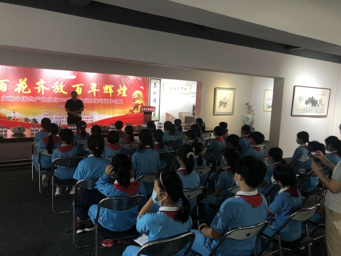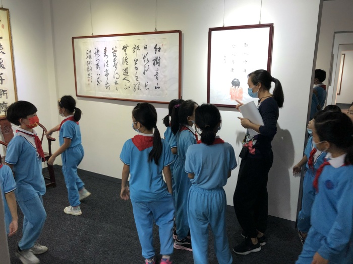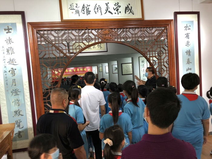 揭牌活動當天適逢中山市成榮美術(shù)館《百花齊放 百年輝煌—-慶祝中國共產(chǎn)黨建黨一百周年全國名家書畫作品展》展覽期間,美術(shù)館張成榮館長和載德小學(xué)余烜軍老師耐心地向同學(xué)們講解中國傳統(tǒng)文化之魅力,引導(dǎo)孩子們學(xué)習(xí)中華藝術(shù)的興趣!
