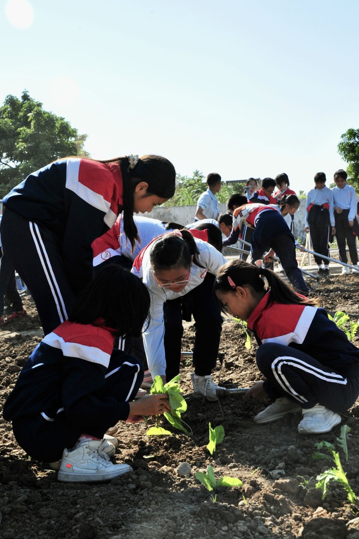 研學(xué)之旅,知行合一。六年級(jí)四個(gè)班的學(xué)生分為兩大組,一組負(fù)責(zé)開拓荒田——種菜苗,一組負(fù)責(zé)刷鍋洗碗——煮飯。