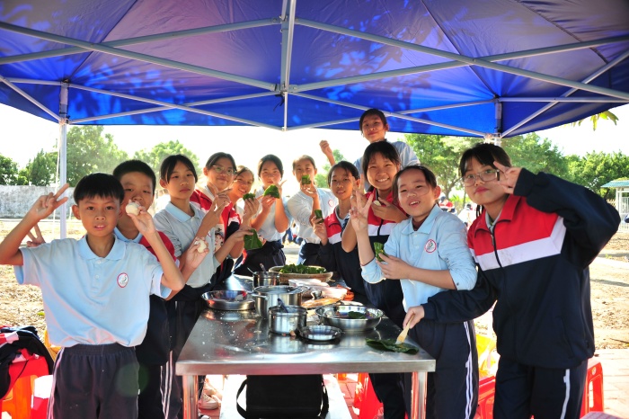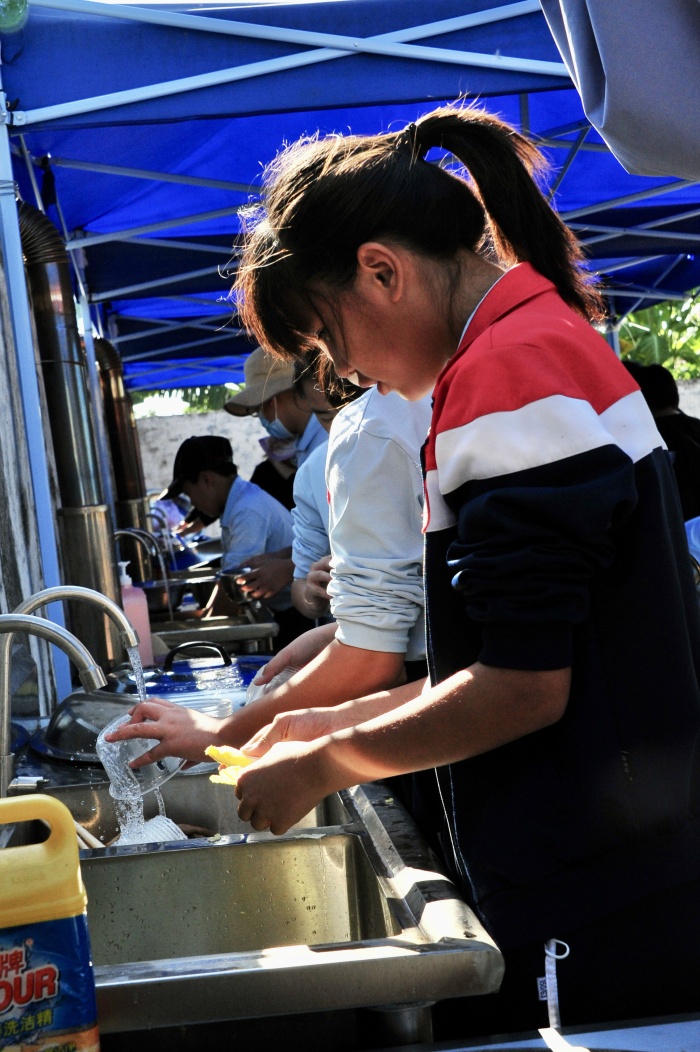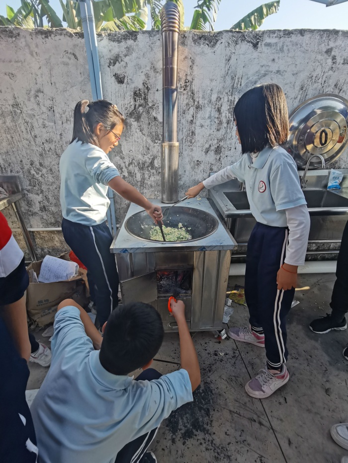 另一邊的同學(xué)正在用親手洗凈的蔬菜瓜果,為大家準(zhǔn)備可口的晚餐。備柴生火、煮飯、切菜、炒菜,同學(xué)們輪流上崗,井然有序。經(jīng)歷煙熏刺眼,爐火熄滅再燃等種種困難,同學(xué)們親手制作的飯菜,仿佛就是美味佳肴。