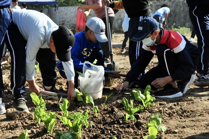 同學(xué)們有種植花卉的經(jīng)驗(yàn),可面對(duì)扎實(shí)堅(jiān)硬的荒地,還是頭一次掄起翻土的鐵鍬呢。在家長和老師的示范下,同學(xué)們輪流學(xué)用沉重的鐵鍬翻地,大塊的泥頭被掘起,菜地里揚(yáng)起一陣灰塵。同學(xué)們深知耕種不易,是實(shí)實(shí)在在的技術(shù)活和體力活。翻土之后就是整地,同學(xué)們用小的鋤頭把大塊的泥頭敲碎,在有種菜經(jīng)驗(yàn)的家長的指導(dǎo)下起壟做畦,種下菜苗,澆水固根。