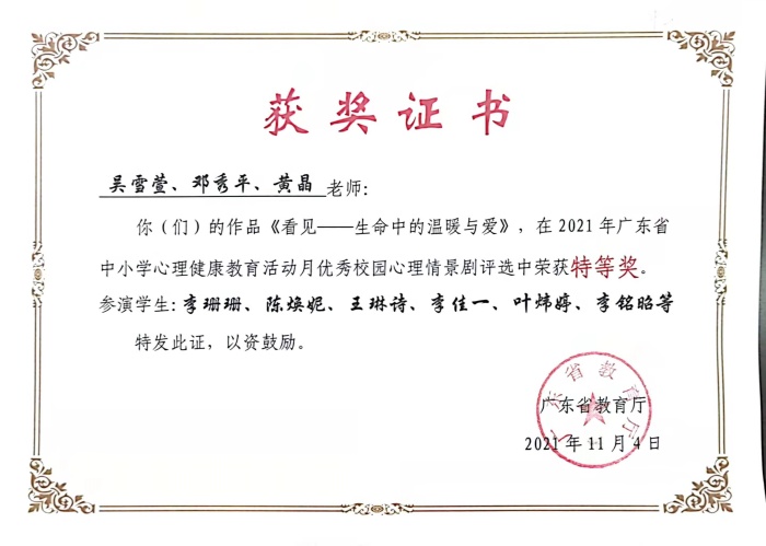 近日,廣東省教育廳公布了2021年中小學(xué)心理健康教育活動月獲獎名單。在吳雪萱、鄧秀平等老師的積極籌劃下,桂山中學(xué)作品《看見——生命中的溫暖與愛》,在廣東省優(yōu)秀校園心理情景劇的評選中榮獲特等獎。