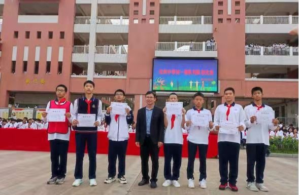比賽結(jié)束后,吳超華主任宣布比賽結(jié)果,榮獲一等獎的班級有三個,二等獎的班級有七個,三等獎的班級有五個,其中初一15班榮獲特等獎。校領(lǐng)導(dǎo)為班級頒發(fā)榮譽獎狀并合影留念。