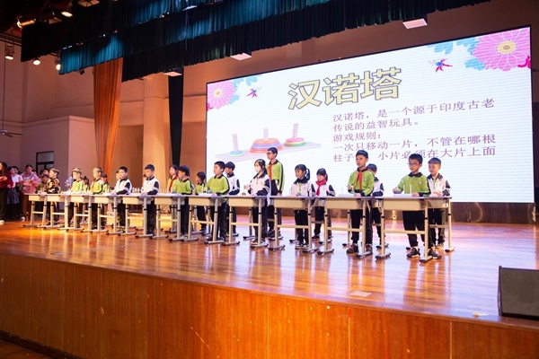 接下來(lái)由二年級(jí)同學(xué)帶來(lái)表演“速移漢諾塔”,他們分別表演3層、4層、5層、6層、7層,在臺(tái)下觀眾的歡呼中,二年級(jí)孩子們聚精會(huì)神,以最快的速度飛速移動(dòng)著手中的漢諾塔,贏得了全場(chǎng)的贊譽(yù)。