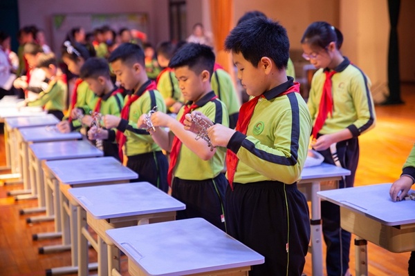 四年級(jí)同學(xué)帶來(lái)表演“神奇的拓?fù)洹?,包括在現(xiàn)場(chǎng)解開(kāi)孔明鎖、魯班鎖、九連環(huán),難度非常大,臺(tái)下的觀眾贊不絕口。