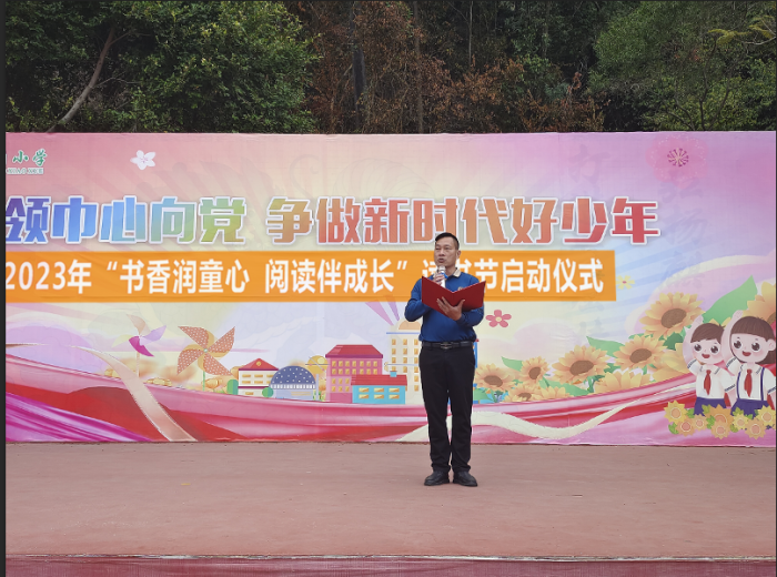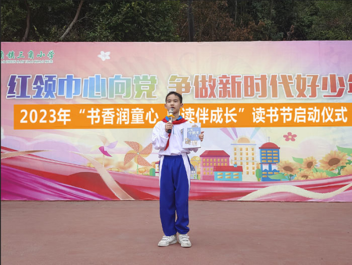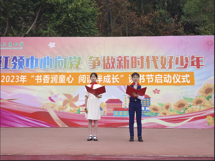 啟動儀式第二項,由三角小學副校長黃麗娟宣讀《三角鎮(zhèn)三角小學2023年“書香潤童心,閱讀伴成長”讀書節(jié)活動方案》。黃副校長向全體同學發(fā)出倡議,號召同學們積極參加讀書節(jié)的各項活動,將知識運用到學習及生活當中,努力做到知行合一。
