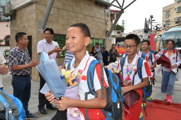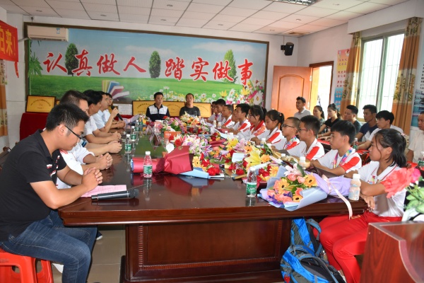7月29日,華文學(xué)校跳繩隊教練和運動員們載譽而歸,橫欄鎮(zhèn)教育事務(wù)指導(dǎo)中心霍嘉俊主任、華文學(xué)校董事梁耀新、祝和群先生、華文學(xué)校謝春生校長以及運動員家長等人到學(xué)校門口迎接他們的歸來,并在學(xué)校會議室舉行了座談會。