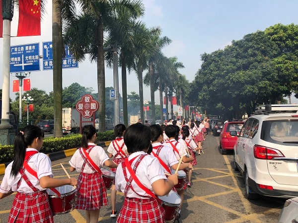 一人參軍,全家光榮。9月9日上午8點(diǎn),南頭鎮(zhèn)穗西和滘心村委辦公樓前門(mén)口聚集了村委會(huì)的領(lǐng)導(dǎo)、新兵的家屬、前來(lái)歡送的村民,熱鬧非凡。升輝小學(xué)的2支鼓號(hào)隊(duì)隊(duì)員們?cè)趨舞b添校長(zhǎng)、德育處黃永釗主任、大隊(duì)輔導(dǎo)員江婷婷老師的帶領(lǐng)下,排著整齊的隊(duì)伍站在村委大樓的門(mén)前歡送新兵入伍。