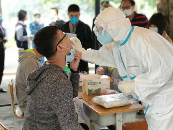 第一批次是南頭鎮(zhèn)初級(jí)中學(xué)走讀生。早上八點(diǎn)十分,學(xué)生陸續(xù)到達(dá)學(xué)校門(mén)口,學(xué)校工作人員馬上組織學(xué)生排隊(duì),測(cè)體溫,進(jìn)入校門(mén)。接著,到達(dá)班級(jí)指定位置集合,由班主任組織學(xué)生用手機(jī)掃粵康碼,顯示綠碼方可進(jìn)行核酸檢測(cè)。隨后,班主任帶領(lǐng)學(xué)生整齊、有序到達(dá)檢測(cè)點(diǎn),排隊(duì)領(lǐng)取采樣裝置等待檢測(cè)。采樣前,身穿防護(hù)服、佩戴護(hù)目鏡、口罩的醫(yī)務(wù)人員會(huì)先對(duì)雙手進(jìn)行消毒,學(xué)校老師協(xié)助醫(yī)生分發(fā)檢測(cè)標(biāo)簽,有序?yàn)閷W(xué)生們采集咽拭子,采樣后對(duì)樣本進(jìn)行密封和外包裝消毒處理,過(guò)程規(guī)范有序。全過(guò)程學(xué)生必須戴口罩,間隔必須控制在1米以上,由學(xué)校老師全程把守。檢測(cè)完成后,學(xué)生要立即離開(kāi)學(xué)校,不得在校園逗留。