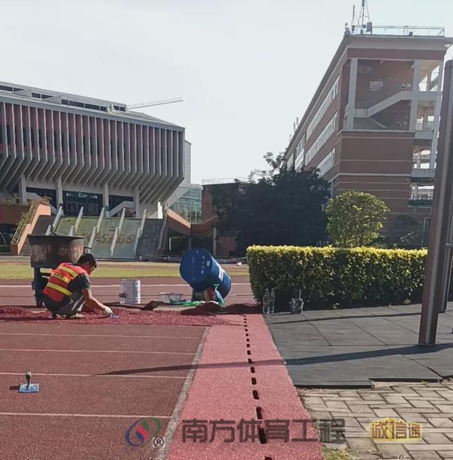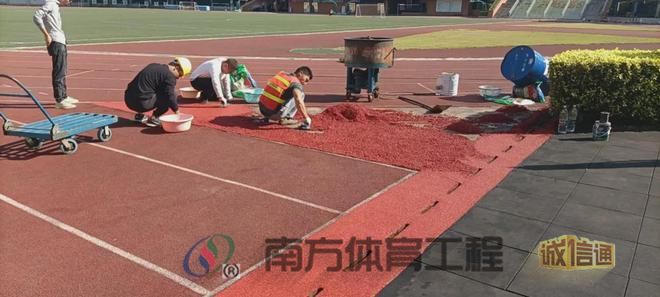 • 塑膠跑道維修翻新請(qǐng)聯(lián)系南方體育工程的售后工程師舒工,電話:13726017833,微信同號(hào)。工藝步驟:1、整體塑膠跑道清除破損、虛浮塑膠層,地基開裂縫隙的地方,直接填注塑膠跑道膠水或者塑膠顆粒。2、修補(bǔ)底層。鏟除塑膠跑道后把地面清理干凈,刷上跑道底膠,然后用的膠水和顆粒攪拌物填補(bǔ)平底層。新鋪設(shè)塑膠顆粒層要壓平,邊縫跟原有底層厚度保持一致,地基有高度差處圓弧平滑過渡。3、噴面。調(diào)制好噴面料,用專用噴涂機(jī)整體噴涂?jī)杀椤5谝槐閲娡苛繛榈诙榈膬?..