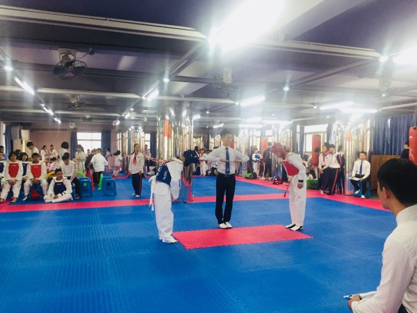 此次比賽的裁判長由楊仙逸小學(xué)鄭妃丹老師擔(dān)任,石岐區(qū)體育科組領(lǐng)導(dǎo)以及各個學(xué)校的帶隊老師及教練出席了本次活動。此次比賽共有15支代表隊報名參加,參賽選手共計100余人。伴隨著輕松而舒緩的音律,各個學(xué)校參賽隊的運動員們昂首挺胸,款款而來,動作嫻熟,張弛有度,充盈著剛健之美,洋溢著青春的氣息,飛揚著動人的神采,完美地詮釋了“禮義、廉恥、忍耐、克己、百折不屈”的跆拳道精神。