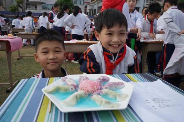 學(xué)校鼓勵(lì)同學(xué)們積極參與,凡報(bào)名即可參加,五百多位同學(xué)報(bào)名參加了本次活動(dòng),桌子在足球場(chǎng)擺放整齊,校園沸騰了。參加本次活動(dòng)的同學(xué)提前備好了糯米面團(tuán)和各種口味的湯圓餡,隨著老師“比賽開(kāi)始”的口令,參賽同學(xué)認(rèn)真的忙活起來(lái)了。雖是第一次參加這類比賽,但同學(xué)們卻別出心裁精心配色搓出了許多色彩繽紛、形狀各異的湯圓。看,有熊貓湯圓、小豬湯圓、南瓜湯圓、橘子湯圓……;經(jīng)過(guò)30分鐘的角逐終于到了關(guān)鍵時(shí)刻,同學(xué)們發(fā)揮想象將類主題運(yùn)用于擺盤上:《流浪地球》、《五谷豐登》、《小豬一家親》、《流星花園》、《如魚得水》、《辣椒醬湯圓》等等紛紛登場(chǎng)讓人目不暇接??粗约旱淖髌?,大家臉上洋溢著興奮與自豪的笑容。