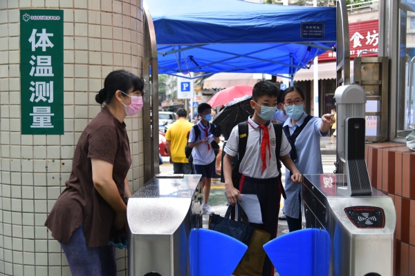 早上7:15分,學(xué)校行政、值日老師、家長護(hù)衛(wèi)隊及蓮峰派出所警察叔叔們,早早地在校門口熱切地等候著返校的師生們。7:20分開始,學(xué)生有序地按學(xué)校錯峰安排陸續(xù)返校,盡管隔著口罩,也能感受到同學(xué)們按奈不住的喜悅之情。在老師的引導(dǎo)下,同學(xué)們以1米間距排隊,依次檢查復(fù)學(xué)碼和承諾書,通過體溫檢測等防疫步驟后才進(jìn)入校園,把好入校安全第一關(guān)。四至六年級273名學(xué)生,全都順利返校。