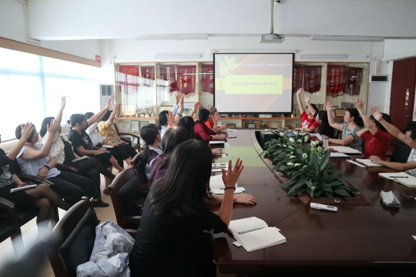 會(huì)議在莊嚴(yán)的國歌聲中正式開始。首先由韓紅梅主任宣布本次教代會(huì)會(huì)議議程和安排。本次會(huì)議有六項(xiàng)內(nèi)容組成:陳紅副校長(zhǎng)致開幕詞和做2018學(xué)年工會(huì)工作小結(jié);宣讀并現(xiàn)場(chǎng)舉手表決《期末文明班評(píng)比方案修改提議》;宣讀《關(guān)于增加報(bào)賬員崗位工資點(diǎn)數(shù)的提案》和《關(guān)于增加教學(xué)質(zhì)量獎(jiǎng)的提案》;發(fā)放民主意見征集表,填寫后收集并進(jìn)行統(tǒng)計(jì);鄭結(jié)霞校長(zhǎng)講話和宣布收集到的民意表決情況。