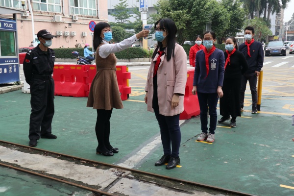 要求學(xué)生排隊入校園,互相間隔1米,進(jìn)入校門兩位老師在校門口內(nèi)負(fù)責(zé)測量體溫,兩位老師隨機(jī)詢問學(xué)生。(若發(fā)現(xiàn)有體溫高于37.3°C,立刻由值班老師帶至隔離觀察區(qū),經(jīng)專門通道至師生發(fā)熱臨時隔離觀察室,第一時間聯(lián)系家長,同時詢問是否有疫區(qū)旅居史,如果有第一時間和疾控中心部門聯(lián)系,同時上報教體局。)體溫正常,無感冒、咳嗽癥狀學(xué)生按既定路線依次進(jìn)入校園。