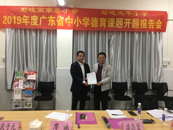 12月6日下午,石岐太平小學(xué)和高家基小學(xué)聯(lián)合在高家基小學(xué)煙墩校區(qū)一號(hào)樓三樓黨員活動(dòng)室舉行了2019年度廣東省中小學(xué)德育課題開題報(bào)告會(huì)。出席報(bào)告會(huì)的有中山市教育工委副書記廖誠(chéng),市中小學(xué)德育中心副主任、石岐區(qū)教育事務(wù)指導(dǎo)中心德育專干潘志堅(jiān),三角鎮(zhèn)蟠龍小學(xué)段子元校長(zhǎng),廣東省名班主任工作室主持人黃文繼老師,石岐太平小學(xué)鄭結(jié)霞校長(zhǎng)引領(lǐng)的太平小學(xué)課題組成員,石岐高家基小學(xué)黃榮勝校長(zhǎng)引領(lǐng)的高家基小學(xué)課題組成員以及石岐實(shí)驗(yàn)小學(xué)馮漢文校長(zhǎng)。