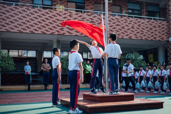 雄壯的愛國歌曲剛結束,低、中、高三個年段的愛國詩詞集體朗誦便一波接一波的涌來,太平小腳丫的赤子愛國之情在澎湃的朗誦聲中表達的淋漓盡致。緊接著就是莊嚴的升旗儀式,四位佩戴著鮮艷紅領巾的升旗手在莊嚴的國歌聲中將五星紅旗徐徐升起,全體教師行注目禮,少先隊員行隊禮,在金秋朝陽的照耀下,五星紅旗顯得更加的驕艷、溫暖與厚重。