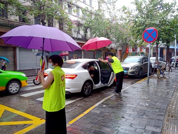 強對流天氣帶來短暫性暴雨,學校護衛(wèi)隊堅守崗位,開始第一天的護校工作。為了保障順利開學,早上6:50他們就早早來到高家基巷口,換好值日服裝,戴上防護手套,開始晨間工作。他們兵分多路,有的在路口疏導交通,有的引導家長有序停車,還有的護送學生過馬路。他們人數(shù)不多,但是分工明確:一部分是負責協(xié)助路邊下車的學生,攔停機動車道車輛,以確保自身安全及學生能安全通行;另一部分是負責開關私家車車門,接送學生,以免造成道路擁堵。并且,由于在疫情期間,護衛(wèi)隊隊長特別強調:“所有隊員在值崗過程中不能觸碰學生及學生物品,人與人間保持至少1米以上安全距離,戴一次性手套?!边@一個個細節(jié)展示了學校護衛(wèi)隊工作的細致、認真和用心。