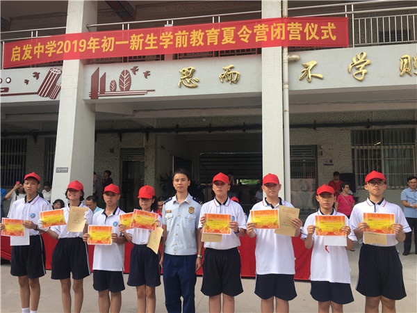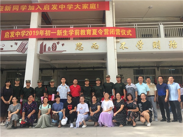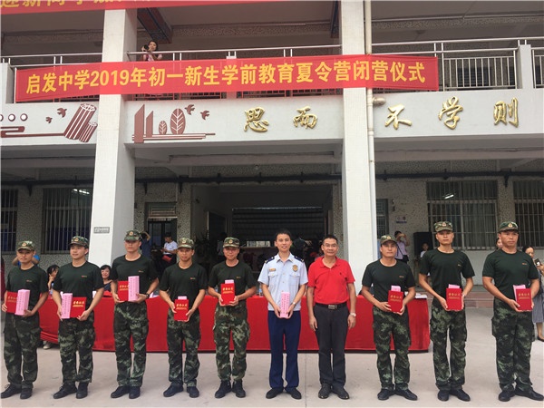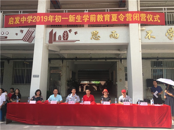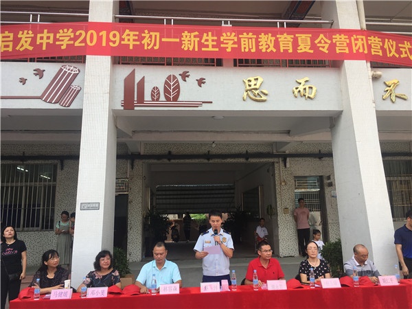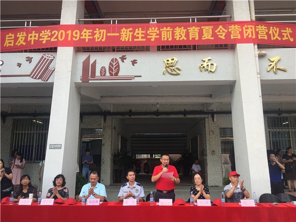 2019年8月29日下午,啟發(fā)中學(xué)初一新生學(xué)前教育夏令營(yíng)閉營(yíng)儀式正式拉開帷幕。參加本次閉營(yíng)儀式的領(lǐng)導(dǎo)和嘉賓有:?jiǎn)l(fā)中學(xué)校長(zhǎng)謝永芳、城區(qū)消防中隊(duì)隊(duì)長(zhǎng)蔡洋、啟發(fā)中學(xué)副校長(zhǎng)祝玉珍、啟發(fā)中學(xué)副校長(zhǎng)林容森、啟發(fā)中學(xué)教務(wù)處主任鄧小斐、啟發(fā)中學(xué)德育處副主任馬健媛;學(xué)校全體行政、全體教官、班主任和初一年級(jí)全體新生;部分新生家長(zhǎng)也積極參加了本次閉營(yíng)儀式。