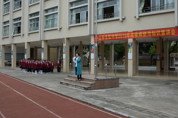 按照《廣東省教育廳關(guān)于做好2019年世界防治結(jié)核病日宣傳教育工作的通知》要求,4月1日早上,北區(qū)中學(xué)師生集中在學(xué)校運(yùn)動(dòng)場(chǎng),在升旗儀式后,趙翠顏校長(zhǎng)先是對(duì)全體同學(xué)進(jìn)行結(jié)核病防治教育。2019年的“世界防治結(jié)核病日”活動(dòng)主題是“開展終結(jié)核行動(dòng),共建共享健康中國(guó)”。趙校長(zhǎng)根據(jù)《學(xué)校結(jié)核病防控工作規(guī)范(要求)》,向師生們宣傳結(jié)核病的防治知識(shí)。