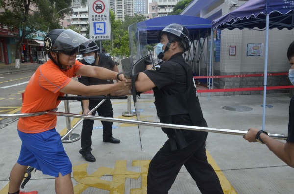 活動(dòng)現(xiàn)場(chǎng)模擬了兩名“不速之客”趁學(xué)校開(kāi)門(mén)之時(shí),手持鐵棍闖入學(xué)校,學(xué)校保安人員立即啟動(dòng)反恐防暴應(yīng)急處置預(yù)案,并報(bào)告學(xué)校安全領(lǐng)導(dǎo)小組。校園安保隊(duì)隊(duì)長(zhǎng)指揮其余安保人員迅速到位,用木棍、警用鋼叉、防暴盾牌等安保器械與“歹徒”搏斗。在旁的男老師馬上隨機(jī)應(yīng)變,隨手拿起掃帚、椅子加入,逐步壓縮“歹徒”的活動(dòng)范圍,把師生受傷害程度控制在最低限度,最后成功將兩名“不速之客”其制服。