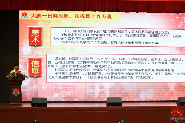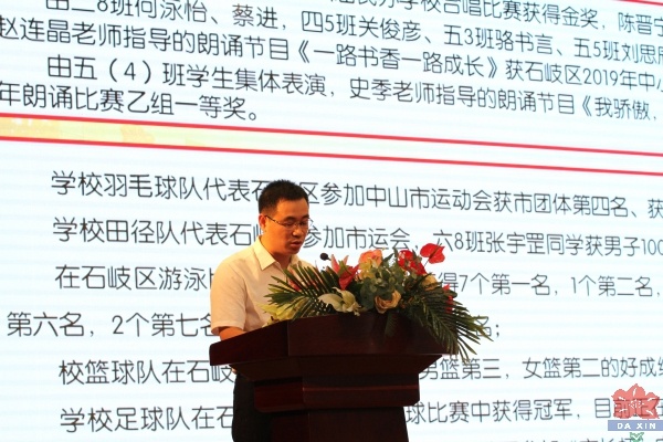 首先,馮冠祥副校長代表學校做了熱情洋溢的總結(jié)性發(fā)言,大鵬一日乘風起,扶搖直上九萬里!馮校長肯定了老師們的辛勤付出,贊揚了同學們本學期所取得的各項成績。德育工作方面學校少先隊被評為中山市少年紅旗大隊;趙連晶老師被評為中山市優(yōu)秀輔導員;崔子傲、何梓瑜、黃景逸、邱丹蘊等榮獲市級好少年;鐘雪殷、郭文月、鄭靜純、駱書言等四人榮獲省級作文優(yōu)秀獎,黎桂芳、辛莉、林晶晶、何婷婷等榮獲優(yōu)秀指導老師獎;王冠、湯嘉琪、王惠等均或石岐區(qū)、中山市比賽一等獎;雷柏謙的父親雷毅豐榮獲“石岐好家長”稱號。教育教學也喜獲豐收。馮冠祥、趙連晶、遲瑩瑩、杜少君、劉陽、寇璐、鄭凱莉等老師均榮獲區(qū)、市論文、課題一等獎。體育、智育等各項比賽都取得了優(yōu)異的成績,獎狀、獎杯、獎牌不勝枚舉。