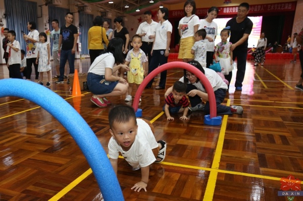 晚上7點,大家紛紛來到了慶?;顒拥闹鲿?---大信學(xué)校體育館。迎接孩子們的是充滿著節(jié)日氣氛的大舞臺,每年的“六?一”所有的孩子都可以在這個大舞臺上一展才藝。隨著主持人的報幕聲響起,”現(xiàn)場立時成為一片歡樂的海洋!舞臺上傳來了小朋友的歌聲、朗通聲、街舞伴奏的音樂聲……小小年紀的寶貝們各有絕活,讓人羨慕!舞臺的對面是游園活動的主陣地,六位義工老師已經(jīng)準備就緒,面帶微笑迎接參加游園活動的小伙伴們?!昂5姿淼馈庇螒蛭簧希瑤讉€步履蹣跚的小家伙在家長的指引下匍匐前進,居然能順利通關(guān);“毽球入筐”孩子們投筐姿勢各異,大一點兒的孩子毫無懸念飛投入筐,小一點兒的孩子也不甘示弱,竟然“近距離入甕”,再小一點兒的孩子甩出的毽球與筐完全不沾邊,引得在旁的家長們捧腹大笑?!白闱蛏溟T”“ 足球保齡球” “羽毛球顛球”每個攤位都有一群小粉絲,他們那專注的眼神,稚拙的動作,引得在場家長們的笑聲此起彼落,整個體育館沉浸在一片歡樂祥和中。