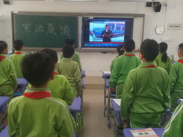 憲法日當(dāng)天早上,學(xué)校組織各班級開展了“讀憲法、學(xué)憲法、懂憲法、爭做守法小公民”主題學(xué)習(xí)活動。全體學(xué)生在老師的帶領(lǐng)下觀看教育部在北京舉辦的“憲法晨讀”活動,并學(xué)習(xí)了《中華人民共和國憲法》第一條、第二條、第五條……第四十六條、第五十四條等重要內(nèi)容。在各班主任老師的領(lǐng)誦下,伴隨著朗朗的誦讀聲,師生們深深地感受到憲法作為國家根本大法的神圣不可侵犯性。