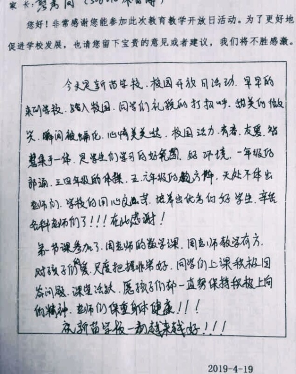 活動(dòng)結(jié)束后,家長(zhǎng)們將學(xué)校印發(fā)的一張張調(diào)查問(wèn)卷交到老師們的手中,家長(zhǎng)們?cè)诔浞终J(rèn)可學(xué)校教學(xué)宗旨與教學(xué)成果的同時(shí),也從學(xué)校管理、教師配備、教師素質(zhì)、教學(xué)管理和安全衛(wèi)生等方面提出了中懇的建議。