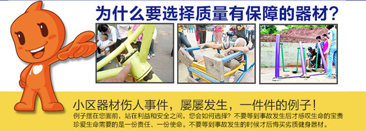 室外健身器材使用壽命 1**類是具有杠面彈力性能的器材。如單杠和雙杠;由于操作者健身運動時離地較高,具有一定的運動難度和危險性,而且長時間反復使用造成的彈性變形,容易使橫杠產生疲勞裂紋和斷裂,在參考競技型單杠安全使用年限1年的基礎上,自2011年10月1日期實施室外健身器材新**標準所有器材的安全使用年限為8年。