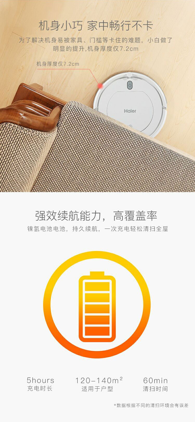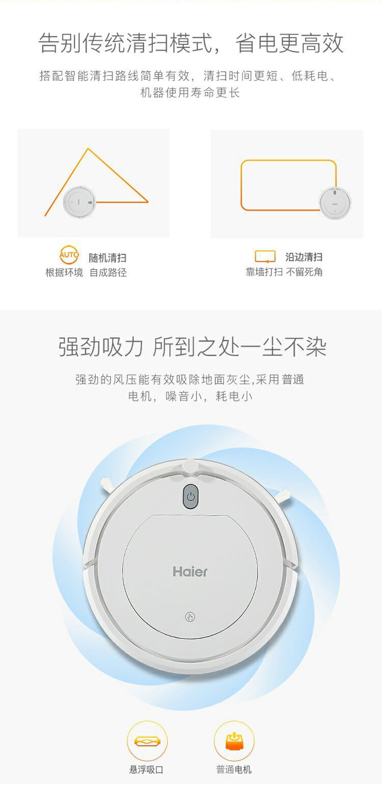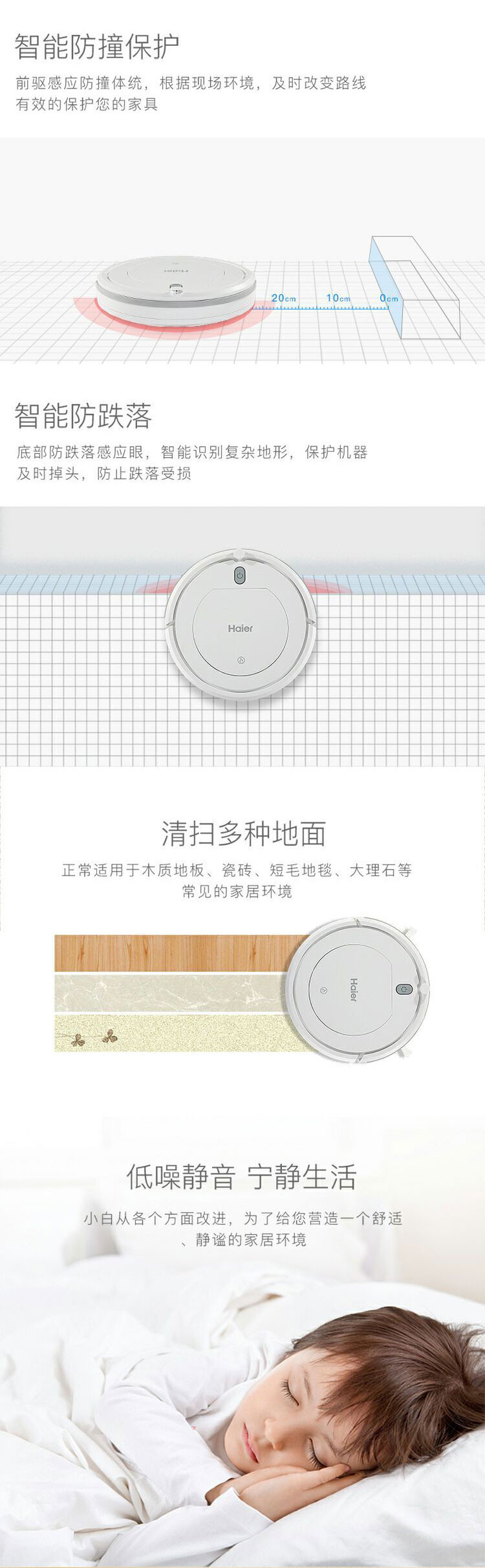 這款機(jī)器噪音非常的小,享受寧?kù)o干凈的生活。能根據(jù)環(huán)境自成路徑,靠墻打掃,沒(méi)有死角可言。底部還有防跌落的感應(yīng)眼睛,智能識(shí)別復(fù)雜的地形,保護(hù)機(jī)器及時(shí)調(diào)頭,防止跌落受損。前驅(qū)感應(yīng)防撞體統(tǒng),根據(jù)現(xiàn)場(chǎng)的環(huán)境能夠及時(shí)的改變路線,有效地保護(hù)您的家具和機(jī)器本身。機(jī)身厚度僅7.2cm,解決了機(jī)身被門(mén)檻、家具卡住的問(wèn)題,適用于木質(zhì)地板、瓷磚、短毛地毯、大理石等等常見(jiàn)的家居環(huán)境。海爾專(zhuān)注研發(fā)家電多年,值得信賴(lài)。