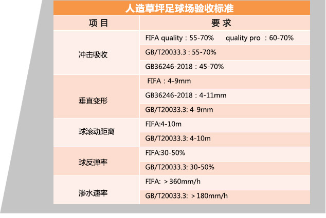 (1)出于安全考慮,2001年國際足聯(lián)頒布了人造草足球場地驗收標準,規(guī)定沖擊吸收需達到55-70% ,比國際田聯(lián)規(guī)定的塑膠跑道沖擊吸收35-50%要高出20%,2006年,國家質(zhì)監(jiān)總局與國家標準化管理委員會發(fā)布了GB/T 20033.3國家標準,規(guī)定沖擊吸收為55-70%。